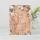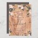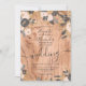 Um legal casamento ao estilo "retro boho chic" com terracota castanha, laranja, cinza e cor de água floral rosa pastel com pampas, algodão com uma elegante e moderna caligrafia escrita sobre uma madeira marrom rústica.