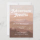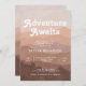 Um convite de chá de fraldas de vassoura de tendência, com montanhas cor-de-rosa e fundo da floresta sobrepostos com fonte retrorada branca e o título editável "Adventure Awaits"