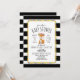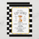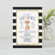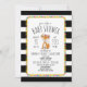 Um convite de chá de fraldas com ilustração de uma raposa bebê vestindo uma coroa de flores. Borda é pom de cores múltiplas em cores inspiradas em boho. O fundo e o verso são faixas pretas e brancas.