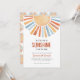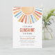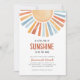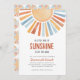 Bem-vindos ao seu pequeno raio de sol com este convite para Chás de fraldas Neutrais de Gênero Sunshine Boho com um adorável brilho de sol amarelo, dourado, laranja, azul e pêssego.