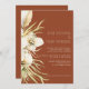 Trendy white floral, palma tropical, e pampas herbáceas de cor verde-d-água, convite para o casamento com uma tipografia moderna sobre um elegante fundo de terracotta assado. +++++ Adequado para jardins de Verão ou para casamentos contemporâneos de destino no deserto à beira-mar.