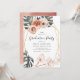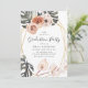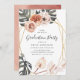 Convite para festa de formatura floral único e elegante, com o nome do formando e os pormenores da festa, rodeados por uma falso estrutura geométrica dourada, folhas tropicais verdes escuras e peônias e orquídeas esfreguesas. A parte traseira do convite apresenta um plano de fundo de aquarela embebido. Projetado para coordenar com a nossa coleção Boho Tropical Floral.