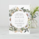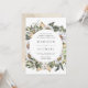 Convite de casamento floral único e elegante que inclui seus detalhes de casamento cercados por flores brancas de aquarela e folhagem exuberante em tons ricos de verde, bege e terra marrom. O convite reverte para um fundo de aquarela bege claro.