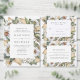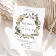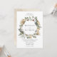 Convite de casamento floral único e elegante, com seus nomes dentro de um quadro hexágono de flores brancas de aquarela e folhagem exuberante em tons ricos de verde, bege e terra marrom. Personalize os convites florais adicionando detalhes como data de casamento, hora, local e informações de recepção. O convite reverte para um fundo de aquarela bege claro.
