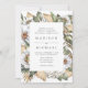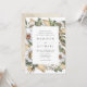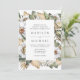 Convite de casamento floral branco elegante, com detalhes de seu casamento moldados por flores brancas de aquarela e folhagem exuberante em tons ricos de verde, bege e terra marrom. O convite reverte para um fundo de aquarela bege claro.