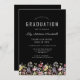 Uma bela borda floral de aquarela de flores silvestres decora a borda inferior deste convite de festa de formatura de vassouras. Personalize o texto branco em um fundo preto, com o nome do formando em script de escrita manual; o ano da escola e da classe em sans serif; e os detalhes de data, local e RSVP na fonte serif. A parte traseira da placa é preta e sólida.