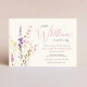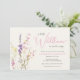 A whimsical light cream baby girl shower invitation featuring "a little wildflower is on her way" showcased in a blend of modern grey typography and an elegant pink calligraphy script, and a boho-inspired watercolor bouquet of dainty purple, pink and yellow wildflowers.