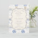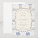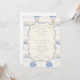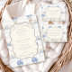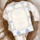 Um doce design inspirado no vintage que apresenta laços azuis delicados, detalhes de listras suaves e ilustrações encantadoras do jardim de mirtilos. Arte no estilo Toile com animais adoráveis e cestas de frutas cria uma sensação clássica de livro de histórias em uma paleta de azul suave em pó. A moldura central ornamentada adiciona elegância, mantendo o visual geral leve, refinado e atemporal. Perfeito para um chá de bebê com um tema de jardim suave e um toque de charme tradicional.