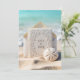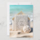 Uma carta de convite de casamento, emboscada, repousa dentro envelope na areia perto da borda do oceano, acompanhado de um dólar de areia. Todo o texto pode ser alterado.