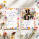 This modern boho graduation design features a vibrant frame of hand-painted wildflowers in a bright, cheerful palette, paired with soft script typography and a clean layout. The front highlights the event details with a delicate floral border, while the photo side showcases multiple images in a relaxed, storytelling style.