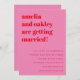 This modern wedding invitation features a bold pink background with ed typography for a confident, contemporary look. The layout includes space for key wedding details along with a convenient online RSVP, making it easy for guests to respond digitally. Designed for couples who want a statement invitation that feels fun, modern, and effortless. Names, date, location, and RSVP information can be customized to match your celebration.