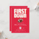 Touchdown! Announce your child's first birthday in touchdown style with this vibrant "First Down" invitation. The striking red background and realistic football image create an exciting, sporty feel, ideal for a little one's milestone celebration. "Albie's First Birthday" is prominently displayed in a charming script, surrounded by all the essential party details like date, time, and address. This design is a winning choice for parents looking for a fun and unique way to invite friends and family to celebrate their baby's first year. Get ready for a party that's sure to be a hit!
