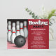 Convites de festas de aniversários de boliches para crianças, adolescentes ou adultos, desenhados em vermelho com uma bola de boliche e um conjunto de cheios de pinos.