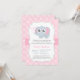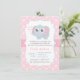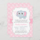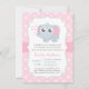Um convite moderno que tem um belo elefante bebê com grandes olhos talentosos que está soprando pequenos corações do seu tronco. Um padrão de bolinhas cor-de-rosa pastel para fundo. Personalize facilmente com os detalhes do seu partido. Adequado para as mamães serem quem espera meninas.