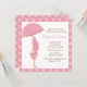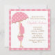 Na moda baby shower convites com uma ilustração de uma futura mãe carregando uma bolsa e um guarda-chuva sobre um fundo polca pontilhado.