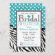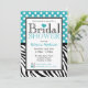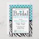 Convites de chá de panela bonitos e na moda com bolinhas brancas sobre turquesa no topo e listras zebra pretas e brancas no fundo. Personalize com os detalhes do chá da noiva e escolha seu tipo de papel também!