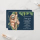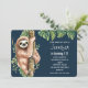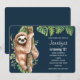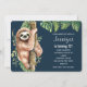 Um convite de aniversário com um design fofo em aquarela apresentando uma preguiça fofa pendurada em um galho de árvore cercada por folhas tropicais verdes.