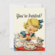 Menina e o Bolo - Um cartão de aniversário retrô dos anos 50 com uma menina decorando um bolo com seu gatinho.
