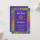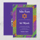 Destaque-se com este convite de Bat Mitzvah único e divertido. Ele apresenta um design de fundo roxo, verde e laranja que você pode levar ao longo do resto do seu evento. Desde decorações de festa até decoração de mesa, suas escolhas são infinitas. Sua filha ficará emocionada com este convite divertido e emocionante para o seu dia especial.