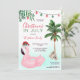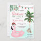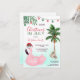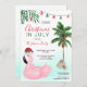 Divertido Natal em julho, flamingo tropical da praia, com folhas de palmeiras, palmeiras, presentes, um floater rosado flamingo, vestindo um chapéu de Papai Noel com névoa. Celebre o verão, a piscina e o Churrasco.