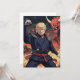 Nessa imagem eletrizante, o presidente Trump vestido de uniforme azul escuro com sotaques vermelhos vibrantes, está pronto para combate. Com um cinto vermelho significando sua proeza, ele atinge uma pose poderosa, punho cercado e olhar fixo. Atrás dele, um gigantesco dragão vermelho com chifres ameaçadores e dentes afiados emerge de uma tempestade de chamas e fumaça. Uma criatura menor parecida com dragão esconde-se ao fundo, aumentando a atmosfera intensa. A cena exude uma sensação de batalha iminente, com elementos de fantasia e proeza marcial se misturando sem parar para criar um visual dinâmico e emocionante.