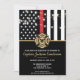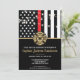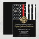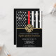 Este design apresenta uma bandeira de bombeiros com listras pretas e brancas, e uma fina faixa vermelha também. Um crachá de bombeiro fica acima de todos os detalhes da festa para o bombeiro aposentado, tenente ou festa de aposentadoria do chefe.