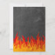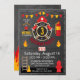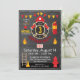 Design de convite de aniversário para fogos de artifício com chamas, equipamento de incêndio, machado, extintor de incêndio, escada, cone, hidrante de incêndio e sino de alarme sobre fundo de chalkboard.