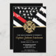 Este convite para a aposentadoria de bombeiros tem uma bandeira de bombeiros com listras pretas e brancas, e uma fina faixa vermelha também. Um crachá de bombeiro fica acima de todos os detalhes da festa para o bombeiro aposentado, tenente ou festa de aposentadoria do chefe. Os convites também podem ser personalizados para um formando da academia de bombeiros.