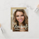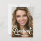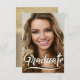Comemore sua graduação com este simples convite para festa de formatura de fotos de script. Este design de placa de graduação tem uma foto na frente e formando o convite de festas na parte traseira do fundo do ombre dourado.