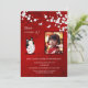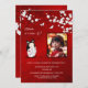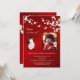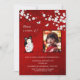 Uma boneca de kokeshi em um Kimono vermelho branco sob uma árvore branca de cherryblossom. Foto da sua filha num fundo vermelho brilhante. Com um texto personalizado em uma fonte elegante para o festa de aniversario de meninas.