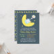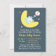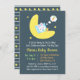 Um coelhinho bebê fofo está aproveitando sua soneca na lua com um pacificador azul em sua boca enquanto pensa em cenouras. Pequenas estrelas brilham ao redor do coelho. Este convite é bonito e alegre para estabelecer o clima para a chá de fraldas ser mamãe! Um padrão de lua e estrela para a página inversa. Personalize facilmente com os detalhes do seu partido. A cor de fundo azul escura pode ser alterada.