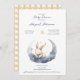 Na moda e fofo, quem não ama coelhinhos? Este design é perfeito para o chá de fraldas que vai ser a futura mãe. Ele apresenta um belo coelhinho em uma lua nublada com estrelas amarelas. A parte traseira apresenta uma cor correspondente e um padrão de estrela. TODO o texto é personalizável para ajustado das necessidades de planejamento de seu partido. Parabéns à nova mãe.