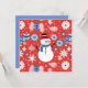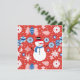 Um boneco de neve fofo com um chapéu vermelho e preto, e um cachecol azul claro. em um fundo vermelho com flocos de neve.