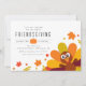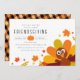 Este convite para apresentação de amigos apresenta um peru giro rodeado por folhas do outono colocadas sobre um fundo branco com abóboras.