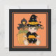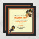 Pequena design de convite preto à bruxa do Dia das Bruxas, apresentando uma bruxa loira do Halloween vestindo vestido e chapéu de bolinhas cor de laranja preto e um corvo numa abóbora. Arte original por revender Clipart.