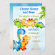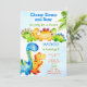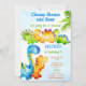Um convite de aniversário de dinossauros de bebês, bonito e colorido; atraente para as crianças, cores brilhantes, bom para festas de aniversário de idade infantil.