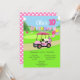 Celebrar o décimo aniversário de uma menina especial com este encantador convite temático de golfe! Apresentando um adorável carrinho de golfe cor-de-rosa estacionado ao lado de um design verde, carregado com detalhes divertidos, um bolo de aniversário festivo, e um monte de balões brilhantes de hélio, incluindo um grande balão número 1. Perfeito para uma família que ama o golfe ou um tema único de décimo aniversário, este convite dá o tom para um dia cheio de diversão no verde.