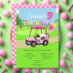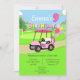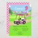 Celebrar o nono aniversário de uma menina especial com este encantador convite temático de golfe! Apresentando um adorável carrinho de golfe cor-de-rosa estacionado ao lado de um design verde, carregado com detalhes divertidos, um bolo de aniversário festivo, e um monte de balões brilhantes de hélio, incluindo um grande balão número 1. Perfeito para uma família que ama o golfe ou para um tema único de nono aniversário, este convite dá o tom para um dia cheio de diversão no verde.