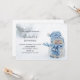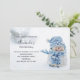 Um convite de aniversário de uma fotografia fofa com um pequeno boneco de neve. Lá fora, no inverno, com neve caindo por toda parte. Esta cara bonita está vestida de roupa azul ao ar livre. Algumas botas brancas/cinzas piscam no fundo.