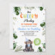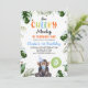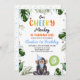 Cute Blue Hat Our Cheeky Monkey Invitation Qualquer idade nosso convite de aniversário para macaco-preguiçoso apresentando um bonitinho, chapéu de festa azul, balão verde e folhagem tropical. Este convite de aniversário de macacos-prego também apresenta uma palavra multicolorida.