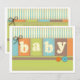 O design de Digitas criado para olhar como uma cobertura adorável do bebê decorou com arco e botão - características deste design um efeito acolchoado aos blocos de cores modeladas no azul, no verde limão, na laranja e no marrom. Um grande esquema de cores trabalha para todo o género, e é neutro bastante se o género do bebê é uma surpresa demasiado. Ao estilo de uma página do álbum de recortes, com combinação de padrões diferentes das listras, das bolinhas e de efeitos de costura por toda parte, todos os elementos são dados a protecção subtil para um efeito dimensional. (note por favor: os elementos do botão e do arco são parte da ilustração digital lisa e não são 3D - são feitos somente para olhar como enfeites realísticos)
