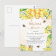 Um fundo branco na moda e ouro de cor d'água. Decorados com espécimes do gênero Bombus, melando mel e favos de mel com flores amarelas, flores e um pote de mel. Com o texto: Chá de panela escrito com um moderno estilo escrito à mão. Personalize e adicione o nome da noiva à abelha. Ouro e letras pretas. Traseiro: design postal. Dica: Se você não quiser que pareça um cartão postal, clique em personalizar, vá para o verso e remova o divisor e o carimbo de posto.