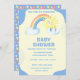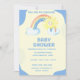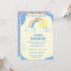 Cute You Are My Sunshine Boys Invitation with a yellow and blue background, a rainbow with a cute sun and nuds A parte de trás é corações caprichosos. Personalize com nosso modelo fácil usando os detalhes do seu chá.