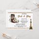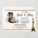 Uma bota de solteiro de pele brilhante é rodeada por pequenas flores florais brancas e cai em verde e tem uma garrafa de vinho espumante com sua cortiça a explodir no ar à sua direita. A borda superior e inferior tem uma fina cadeia de gemstone de diamante liso, revestida com ouro falso, que enquadra modelos de texto editáveis pretos, definidas em um fundo branco. Este design de conteúdo elegante e genérico é ideal para um chá de panela temático "botas e espumante" do país ocidental.