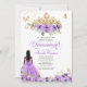 Convite de quinceanera em tons lilás e lavandas de púrpura com borboletas de ouro e uma bela tiara e uma garota de vestido de bola. Visite o compro para obter mais variações no tom de pele e combinações de cores