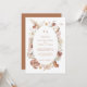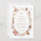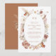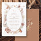 O design moderno e romântico de convite de casamento BOHO com flores silvestres foi pintado à mão em aquarela pela artista e designer internacionalmente licenciada, Audrey Jeanne Roberts. Flores silvestres secas e de cores quentes e suaves se misturam lindamente com o fundo de terracota enferrujada e são dispostas em uma moldura oval solta com arte linear e um par de borboletas delicadas e folhagens de folhas de Gingko. Esta versão tem uma frente branca leve e arejada com texto em terracota e fundo no verso. Direitos autorais.
