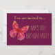 Um belo convite de aniversário, totalmente personalizável, adequado para uma criança, menina ou adolescente. Este design bonito é para uma festa de menina e tem uma imagem de uma ilustração de borboleta rosa contra um fundo roxo escuro - a cor de fundo é personalizável.
