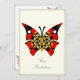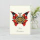 Este presente caracteriza uma borboleta ilustrada em cores ricas escuras, no vermelho predominante carmesim, no ouro e no preto.