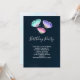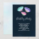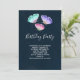 Convite de festa de aniversário com um design feminino delicado. 3 borboletas em aquarela, pintadas de rosa, roxo e verde. Fundo em aquarela azul escuro.