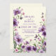 Fronteira de flores roxas e código QR RSVP Convite para casamento. Convide seus convidados com um toque de romance de eterno. Este convite encantador de casamento apresenta uma fronteira cativante de flores roxas ricas de anêmona num delicado estilo de safra. Folhas verdes e borboletas brancas flutuam graciosamente, todas colocadas sobre um fundo suave e cremoso, esbranquiçado. O design casado sofistica com um toque pessoal, combinando fontes elegantes clássicas e fluentes de caligrafia de script. Para uma conveniência moderna, o verso inclui um código de QR discreto para RSVP on-line sem problemas.